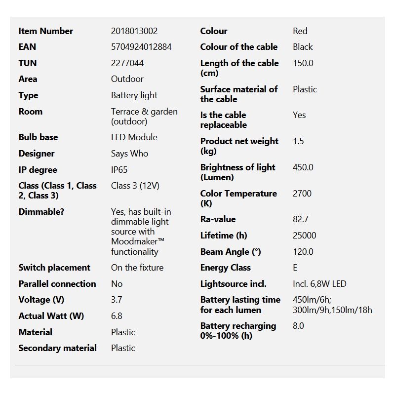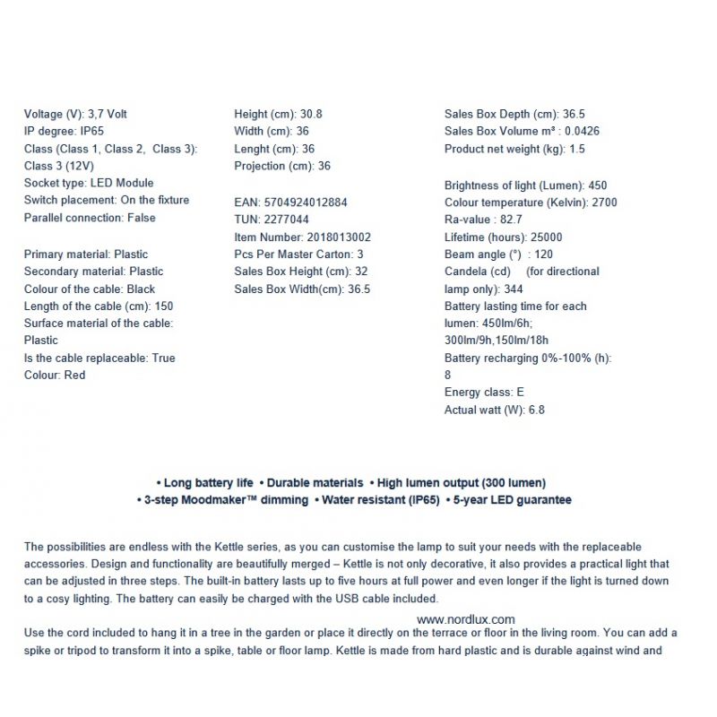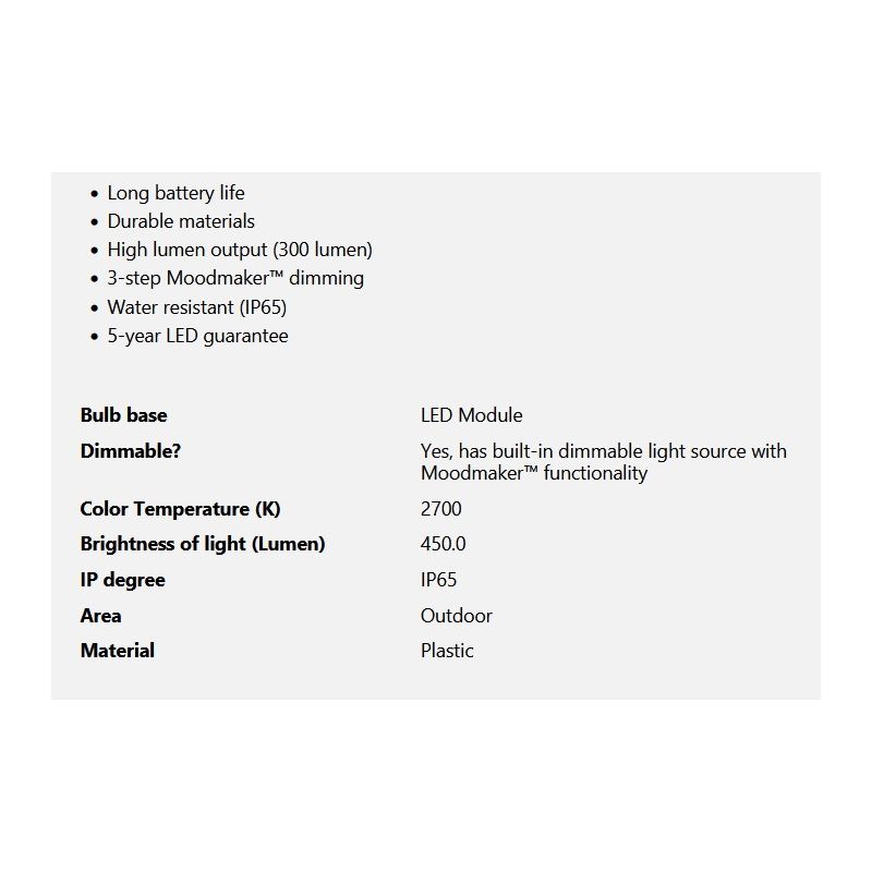 Informatii produs: | lampa de exterior si interior portabila cu protectie la umiditate IP65, baterie reincarcabila, statie de incarcare si cordon pt suspensie inclus |