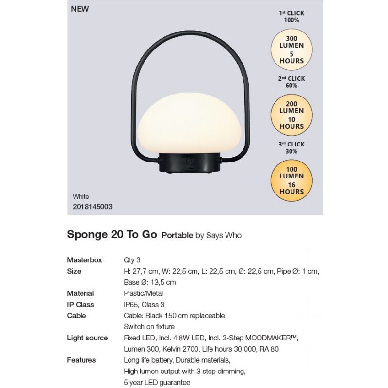 Designul simplu și formele moi fac din Sponge o serie incredibil de elegantă, potrivită în interiorul și exteriorul casei. Cu bateria încorporată, Sponge poate fi plasat și mutat după cum doriți, în copacul din grădină cu șnurul inclus sau așezați-l direct pe terasa, simultan, luminozitatea luminii poate fi reglată pe trei niveluri. Bateria are o durabilitate de până la cinci ore la o putere maximă și chiar mai mult dacă lumina este redusă la un iluminat confortabil. Bateria se încarcă cu ușurință prin intermediul cablului USB inclus.