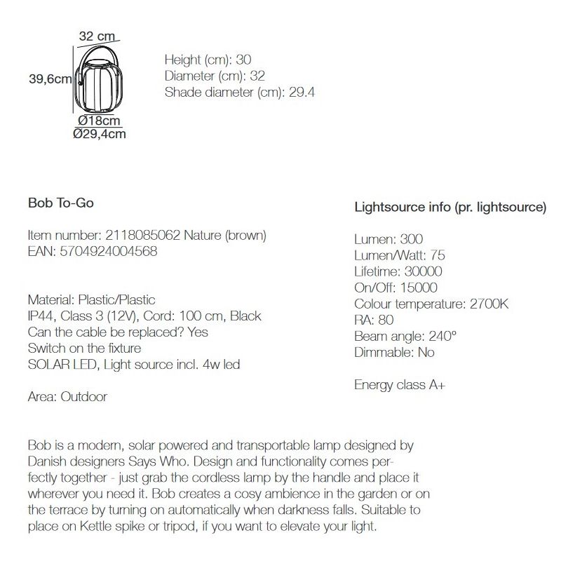 Bob este o lampă modernă, alimentată cu energie solară și transportabilă, proiectată de designerii danezi Says Who. Designul și funcționalitatea se îmbină - doar apucați lampa fără fir de mâner și plasați-o oriunde aveți nevoie. Bob creează o ambianță confortabilă în grădină sau pe terasă, pornind automat când se întunecă. Potrivit pentru a fi așezat pe un vârf de fierbător sau un trepied, dacă doriți să vă ridicați lumina.