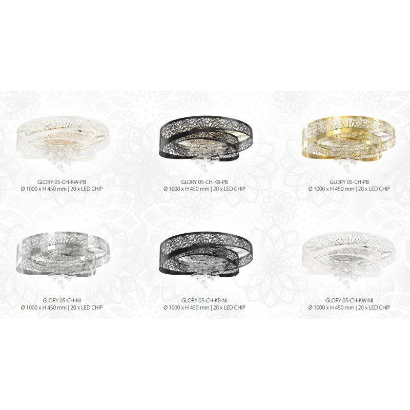 GLORY este o colecție de corpuri de iluminat inspirată de frumusețea naturii. Abajurul perforat din metal cu motivul florii de lotus, care a devenit un simbol al purității și renașterii datorită formei, parfumului și culorii. Colecția Glory oferă o mare varietate de modele și combinații de culori ale finisajelor, unele modele pot fi completate de bule de sticlă, care completează iluzia căii florii de lotus până la suprafața apei. Fiecare dintre opțiunile de culoare ale finisajului pe care le vedeți în această prezentare este disponibilă pentru orice lustra din gama GLORY.