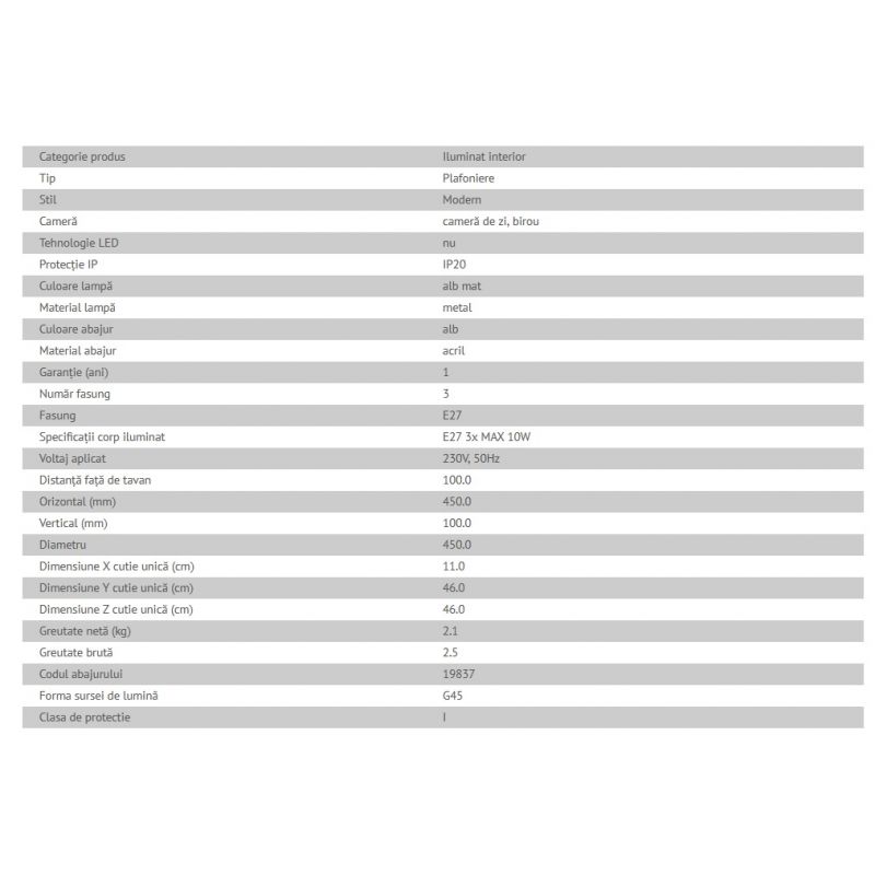 | Putere | 3x max.10Watt, bec E27 exclus din pret |