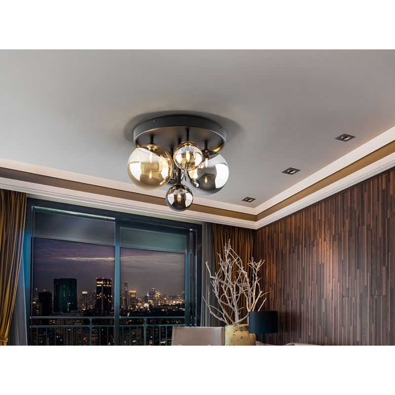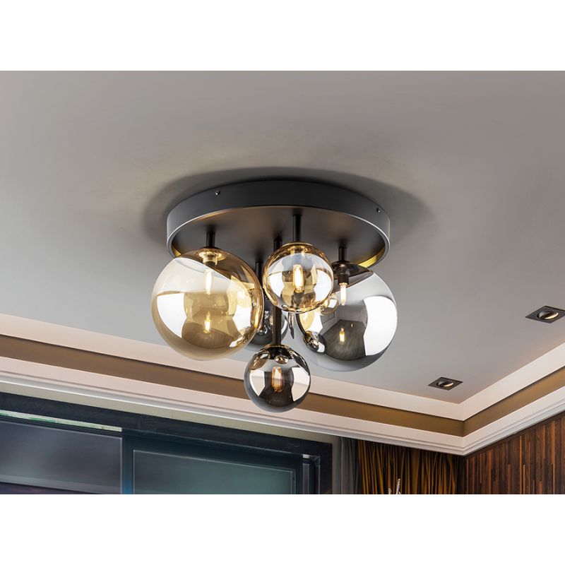 | Descriere | metal finisaj negru mat cu detalii alama satinata, abajur sticla sferica decorativa de 12cm si 20cm in finisaj chihlimbar și gri fumuriu |