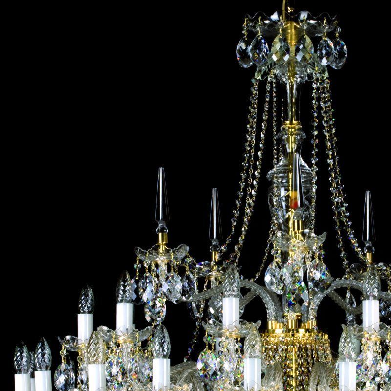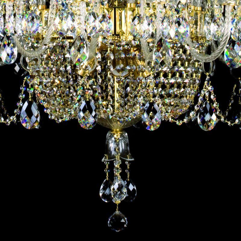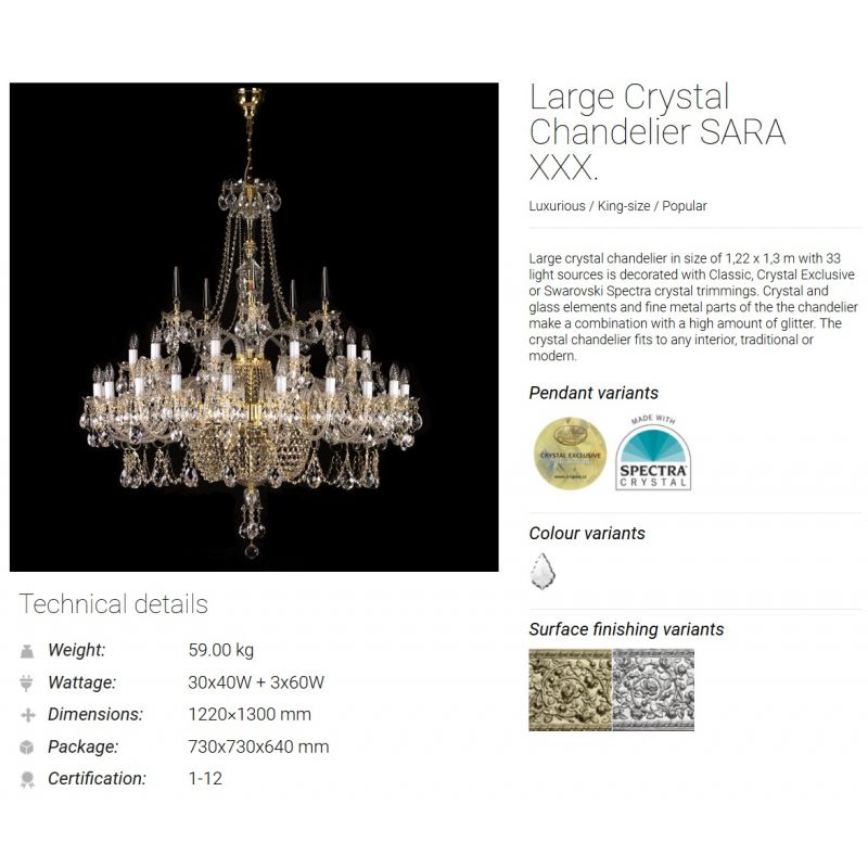 Candelabrul de cristal este decorată cu garnituri de cristal Crystal Exclusive. Componentele din cristal și sticlă și piesele metalice fine în finisaj auriu, argintiu sau alte suprafețe fac o combinație uimitoare. Lumina lustrei de cristal, combinată în special cu alte candelabre de cristal, este potrivită pentru orice interior, modern sau tradițional.