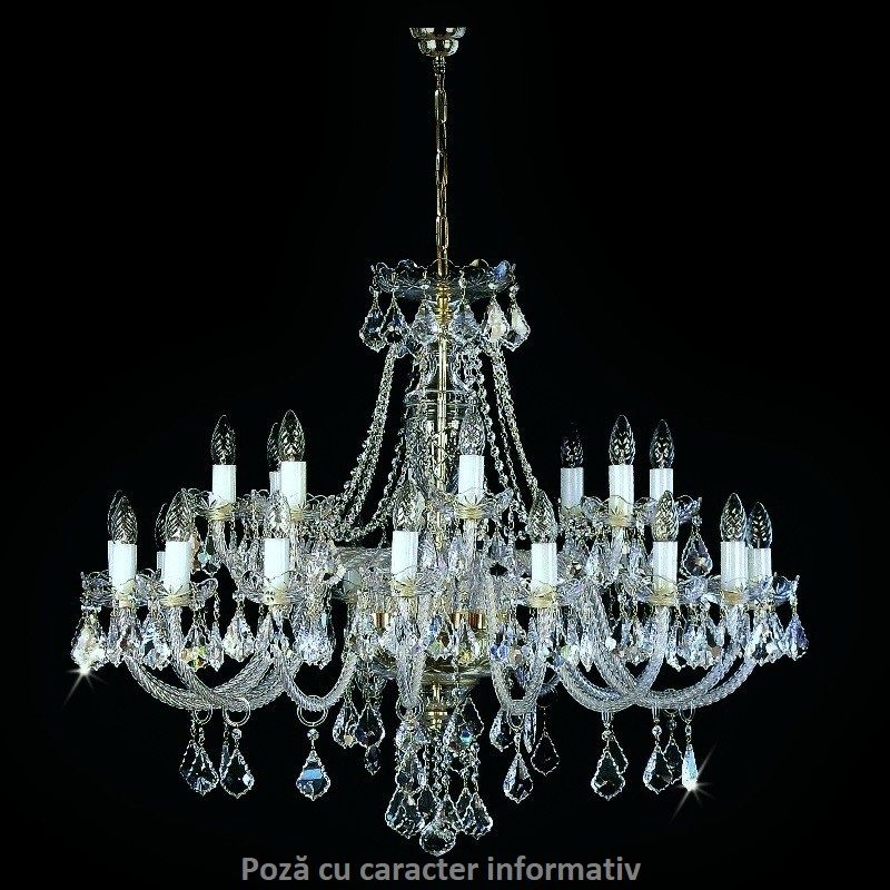Candelabrul de cristal este decorată cu garnituri de cristal Crystal Exclusive. Componentele din cristal și sticlă și piesele metalice fine în finisaj auriu, argintiu sau alte suprafețe fac o combinație uimitoare. Lumina lustrei de cristal, combinată în special cu alte candelabre de cristal, este potrivită pentru orice interior, modern sau tradițional.