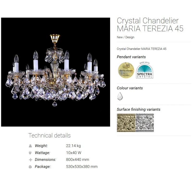 Printre iluminatul cu cristale, candelabrele MARIA TEREZIA fac o categorie unică datorită designului său tradițional, popular timp de secole. Candelabrul MARIA TEREZIA este o adevărată bijuterie printre candelabrele din cristal.
