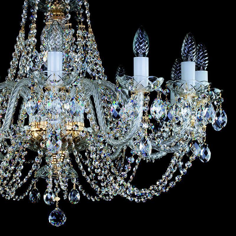 Lustra de cristal este decorată cu Crystal Exclusive. Componentele din cristal și piesele metalice fine în finisaj auriu, argintiu sau alte finisaje fac o combinație uimitoare. Lumina lustrei de cristal, combinată în special cu alte candelabre de cristal, este potrivită pentru orice interior, modern sau tradițional.