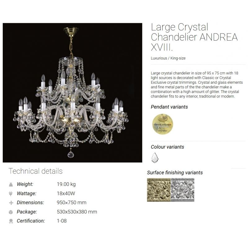 Cristalul utilizat are un conținut de până la 30% PbO, specific cristalului Bohemia, permițând realizarea unor forme variate de pandantive, inclusiv variante transparente sau colorate, în funcție de colecție. Structura metalică a corpurilor de iluminat este disponibilă, în funcție de model, în finisaje precum alamă auriu sau galvanizat argintiu.