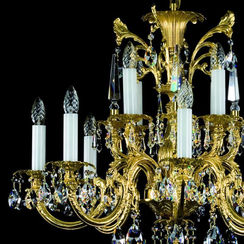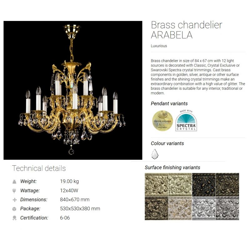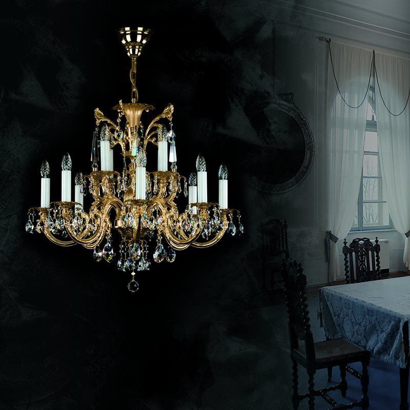 Candelabru din alamă decorat cu garnituri de cristal, Crystal Exclusive. Componentele din alamă turnată în finisaje aurii, argintii, antice sau alte suprafețe și garniturile strălucitoare din cristal fac o combinație extraordinară cu o valoare ridicată. Candelabrul din alamă este potrivit pentru orice interior, tradițional sau modern.