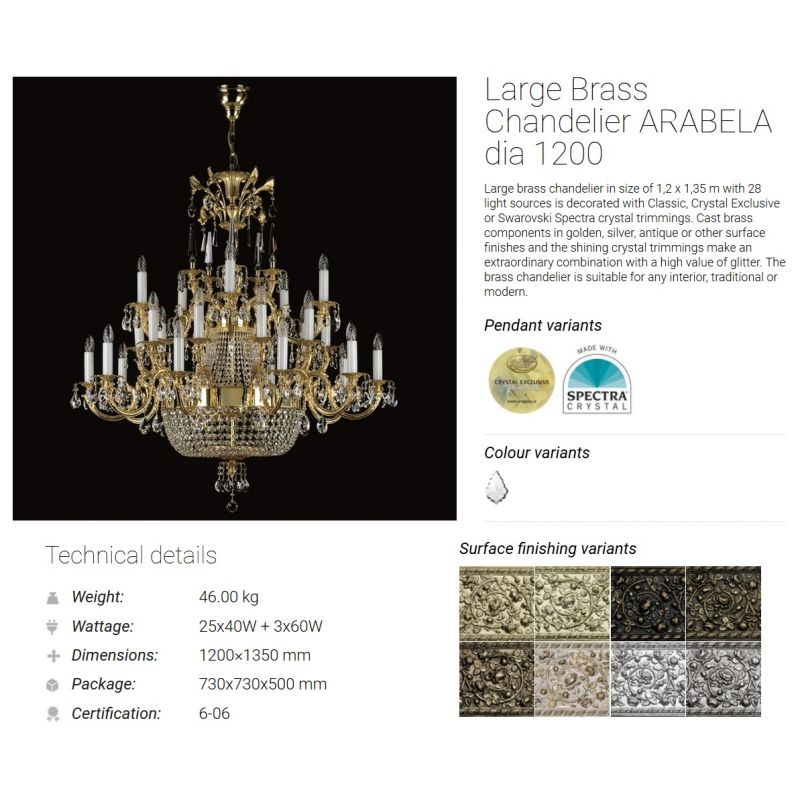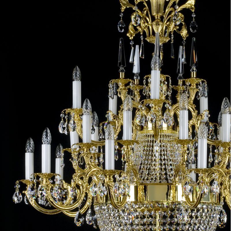 Candelabru din alamă decorat cu garnituri de cristal, Crystal Exclusive. Componentele din alamă turnată în finisaje aurii, argintii, antice sau alte suprafețe și garniturile strălucitoare din cristal fac o combinație extraordinară cu o valoare ridicată. Candelabrul din alamă este potrivit pentru orice interior, tradițional sau modern.