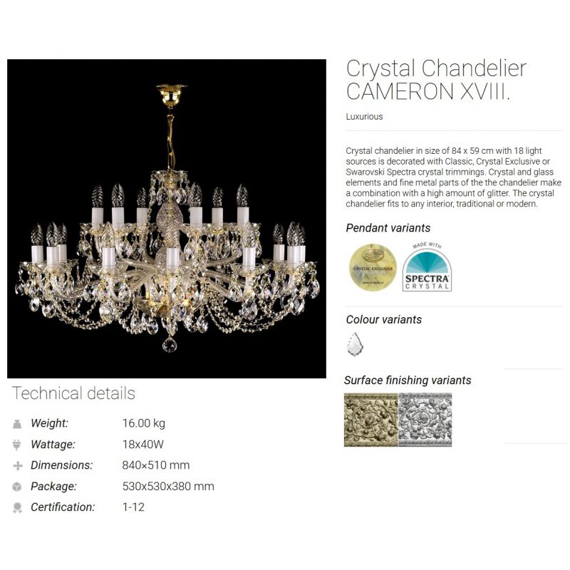 Cristalul utilizat are un conținut de până la 30% PbO, specific cristalului Bohemia, permițând realizarea unor forme variate de pandantive, inclusiv variante transparente sau colorate, în funcție de colecție. Structura metalică a corpurilor de iluminat este disponibilă, în funcție de model, în finisaje precum alamă auriu sau galvanizat argintiu.