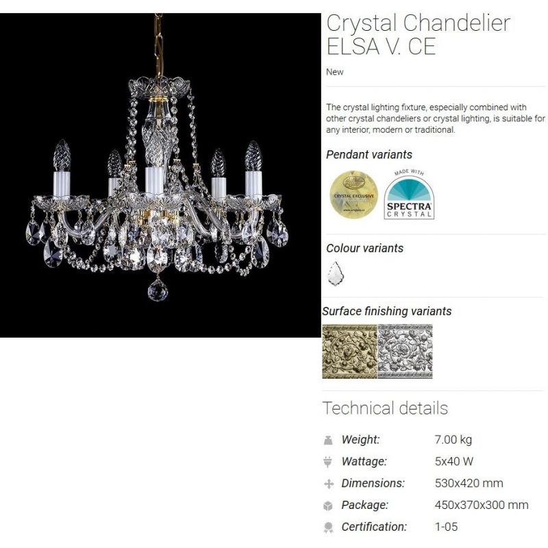 Cristalul utilizat are un conținut de până la 30% PbO, specific cristalului Bohemia, permițând realizarea unor forme variate de pandantive, inclusiv variante transparente sau colorate, în funcție de colecție. Structura metalică a corpurilor de iluminat este disponibilă, în funcție de model, în finisaje precum alamă auriu sau galvanizat argintiu.