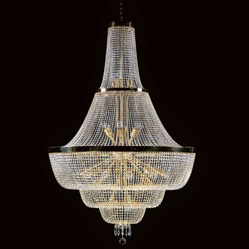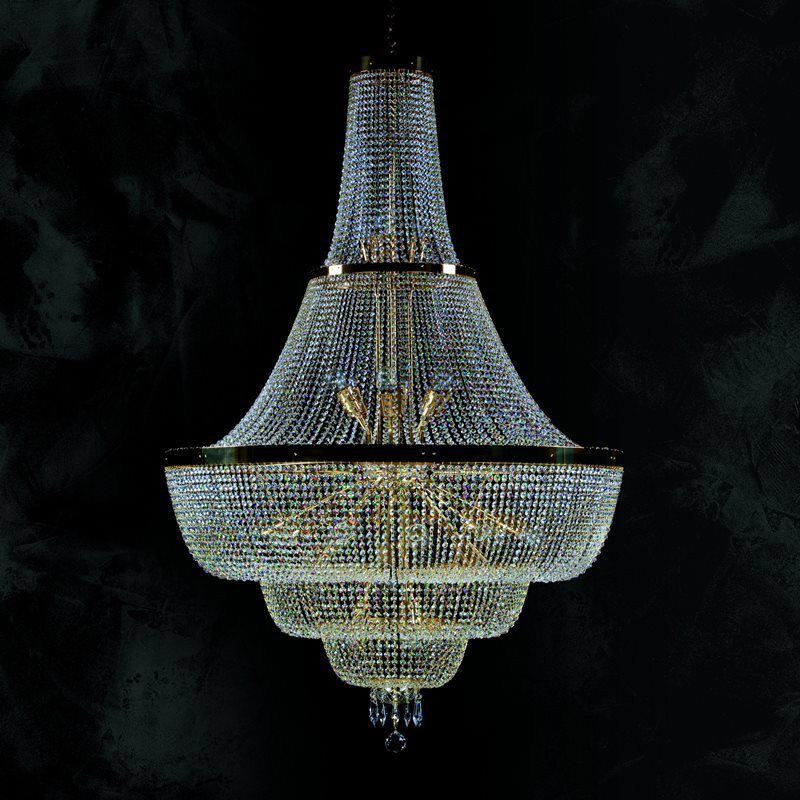 Lustra eleganta de dimensiuni mari, Lustra imperial decorată cu garnituri de cristal Crystal Exclusive. Componentele din cristal și piesele metalice fine în finisaj auriu, argintiu sau alte suprafețe antichizate fac o combinație extraordinară. Lustra din cristal, combinată în special cu alte lustre de cristal sau corpuri de iluminat, este potrivit pentru orice interior, modern sau tradițional.