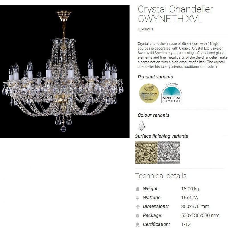 Cristalul utilizat are un conținut de până la 30% PbO, specific cristalului Bohemia, permițând realizarea unor forme variate de pandantive, inclusiv variante transparente sau colorate, în funcție de colecție. Structura metalică a corpurilor de iluminat este disponibilă, în funcție de model, în finisaje precum alamă auriu sau galvanizat argintiu.