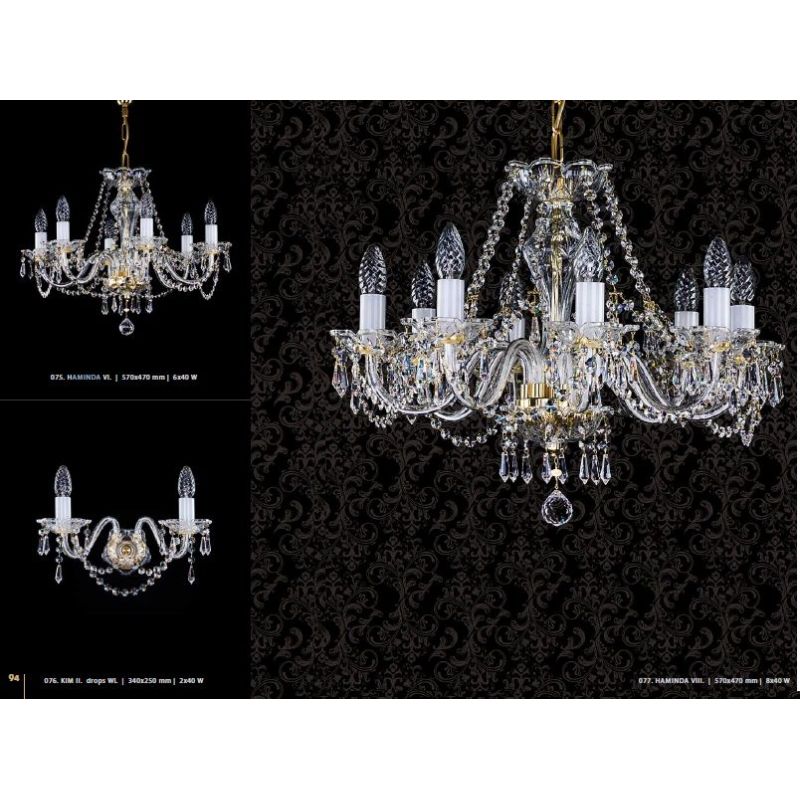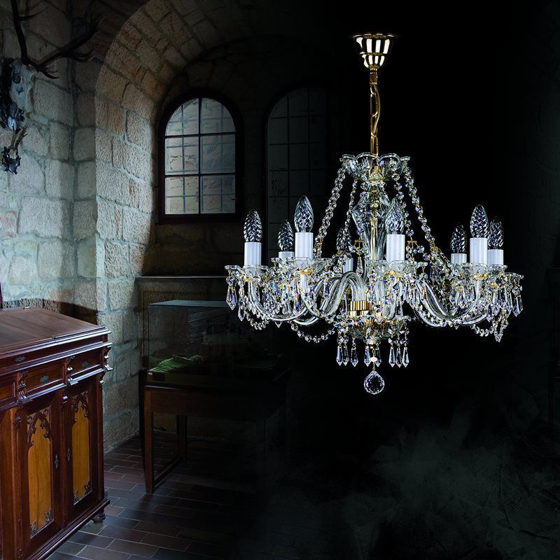 Lustra eleganta decorată cu garnituri de cristal Crystal Exclusive. Componentele din cristal, sticlă și piesele metalice fine în finisaj auriu, argintiu sau alte suprafețe antichizate fac o combinație extraordinară. Lustra din cristal, combinată în special cu alte lustre de cristal sau corpuri de iluminat, este potrivit pentru orice interior, modern sau tradițional.