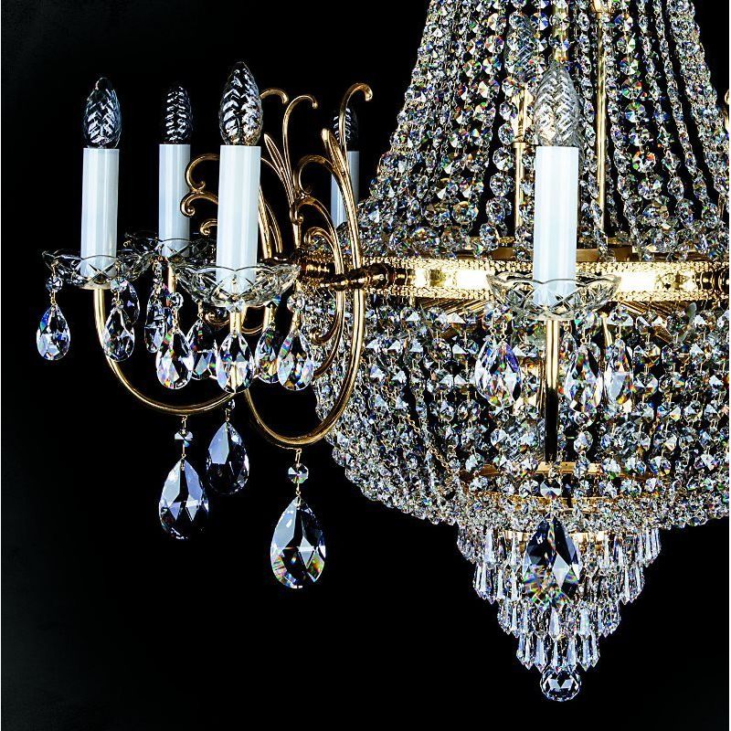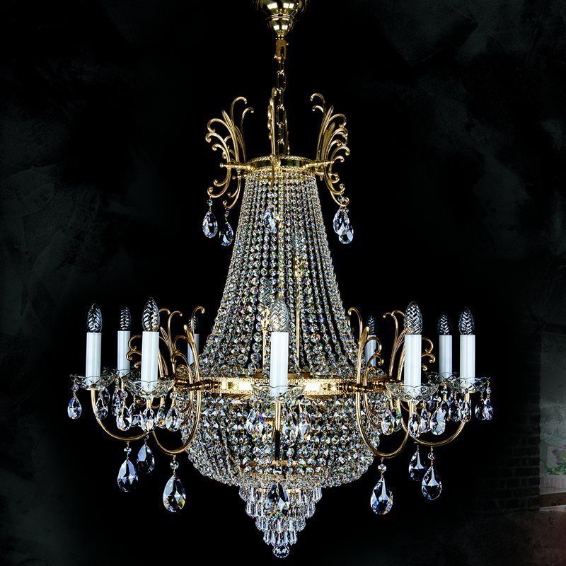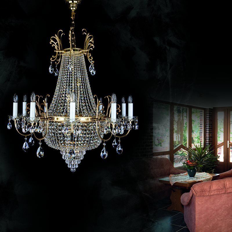 Lustra elegantă decorată cu garnituri de cristal Crystal Exclusive. Componentele din cristal, sticlă și piesele metalice fine în finisaj auriu, argintiu sau alte suprafețe antichizate fac o combinație extraordinară. Lustra din cristal, combinată în special cu alte lustre de cristal sau corpuri de iluminat, este potrivit pentru orice interior, modern sau tradițional.