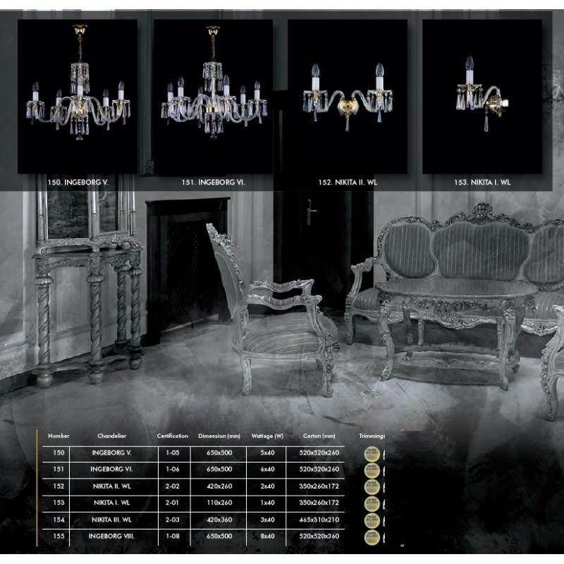 Lustra eleganta decorată cu garnituri de cristal Crystal Exclusive. Componentele din cristal, sticlă și piesele metalice fine în finisaj auriu, argintiu sau alte suprafețe antichizate fac o combinație extraordinară. Lustra din cristal, combinată în special cu alte lustre de cristal sau corpuri de iluminat, este potrivit pentru orice interior, modern sau tradițional.