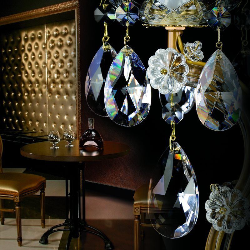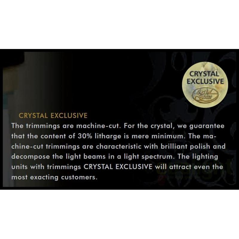 Candelabrul de cristal este decorat cu cristal Crystal Exclusive. Componentele din cristal și sticlă și piesele metalice fine în finisaj auriu, argintiu sau alte suprafețe fac o combinație uimitoare. Lumina lustrei de cristal, combinată în special cu alte candelabre de cristal, este potrivită pentru orice interior, modern sau tradițional.