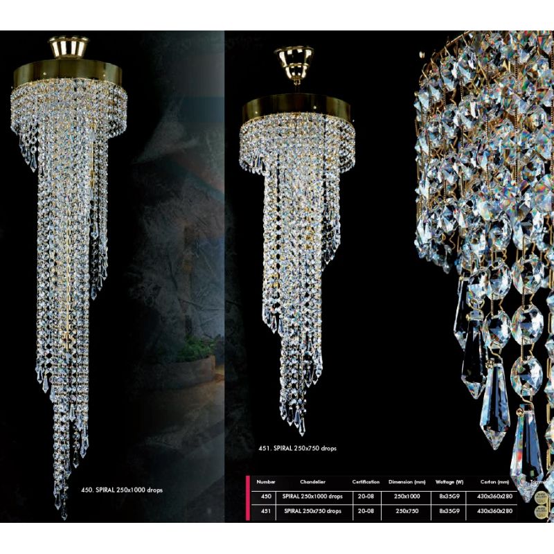 Cristalul utilizat are un conținut de până la 30% PbO, specific cristalului Bohemia, permițând realizarea unor forme variate de pandantive, inclusiv variante transparente sau colorate, în funcție de colecție. Structura metalică a corpurilor de iluminat este disponibilă, în funcție de model, în finisaje precum alamă auriu sau galvanizat argintiu.