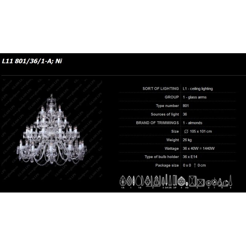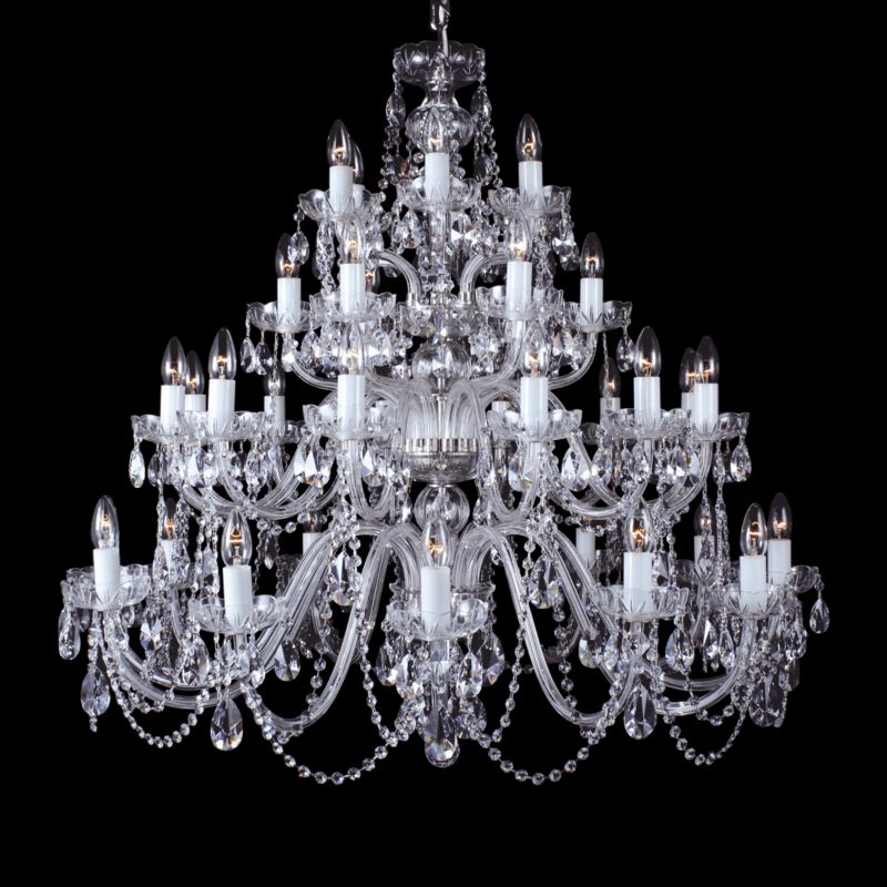 Candelabru XL cu 36 brate este decorat cu garnituri de cristal Bohemia si brate din sticla. Componentele din cristal și sticlă și piesele metalice fine în finisaj auriu sau argintiu fac o combinație uimitoare. Lumina lustrei de cristal, combinată în special cu alte candelabre de cristal, este potrivită pentru orice interior, modern sau tradițional.
