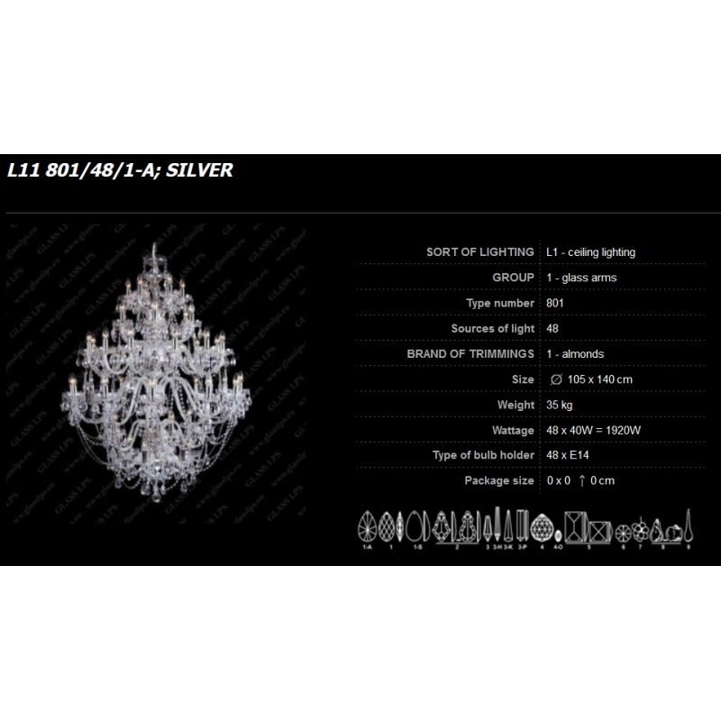 Candelabru XL cu 36 brate este decorat cu garnituri de cristal Bohemia si brate din sticla. Componentele din cristal și sticlă și piesele metalice fine în finisaj auriu sau argintiu fac o combinație uimitoare. Lumina lustrei de cristal, combinată în special cu alte candelabre de cristal, este potrivită pentru orice interior, modern sau tradițional.