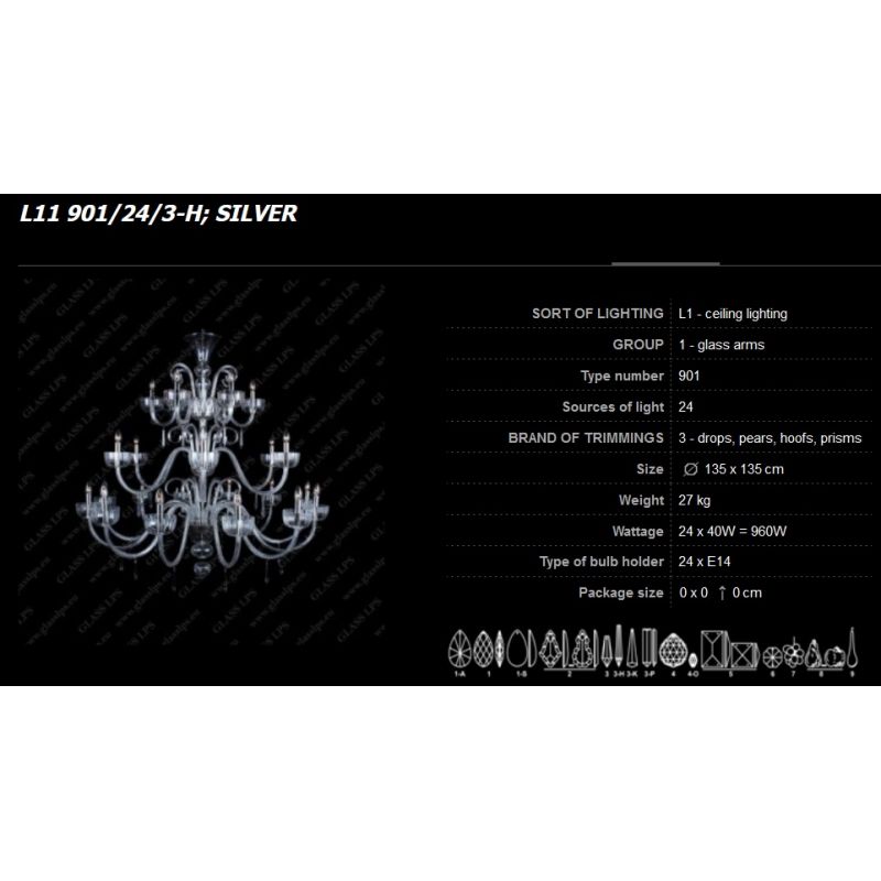 | Descriere | cristal Bohemia, metal alama disponibil in finisaj gold sau silver, sticla, brate din sticla, tubul de la fasung in finisajul metalului ales |