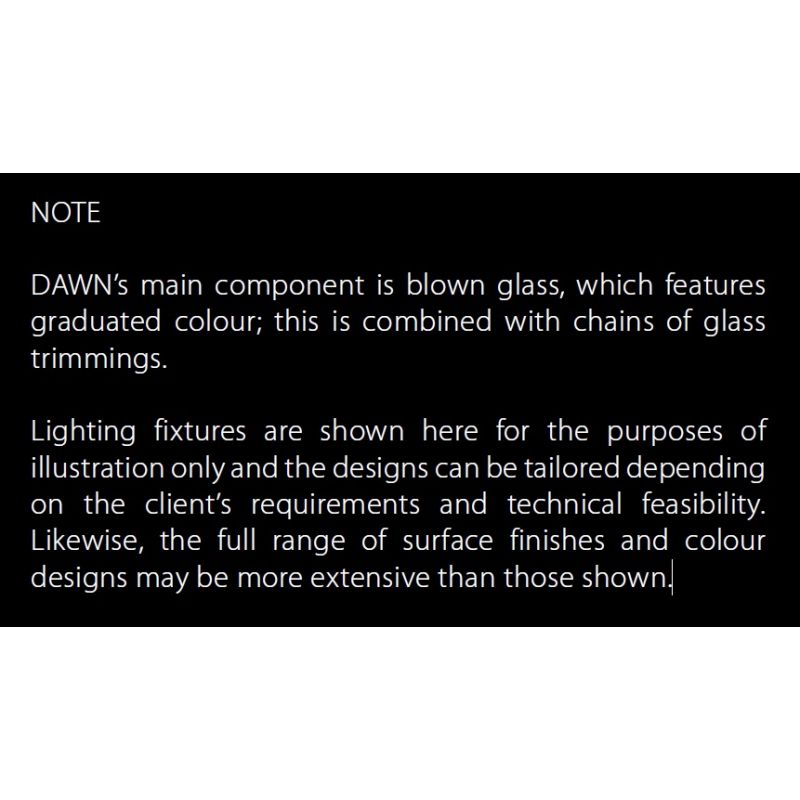 Componenta principală a gamei DAWN este sticla suflată, care are caracteristici culoare gradată, aceasta este combinată cu lanturi de cristale. Corpurile de iluminat prezentate pot fi adaptate în funcție de cerințele clientului și fezabilitatea tehnică.