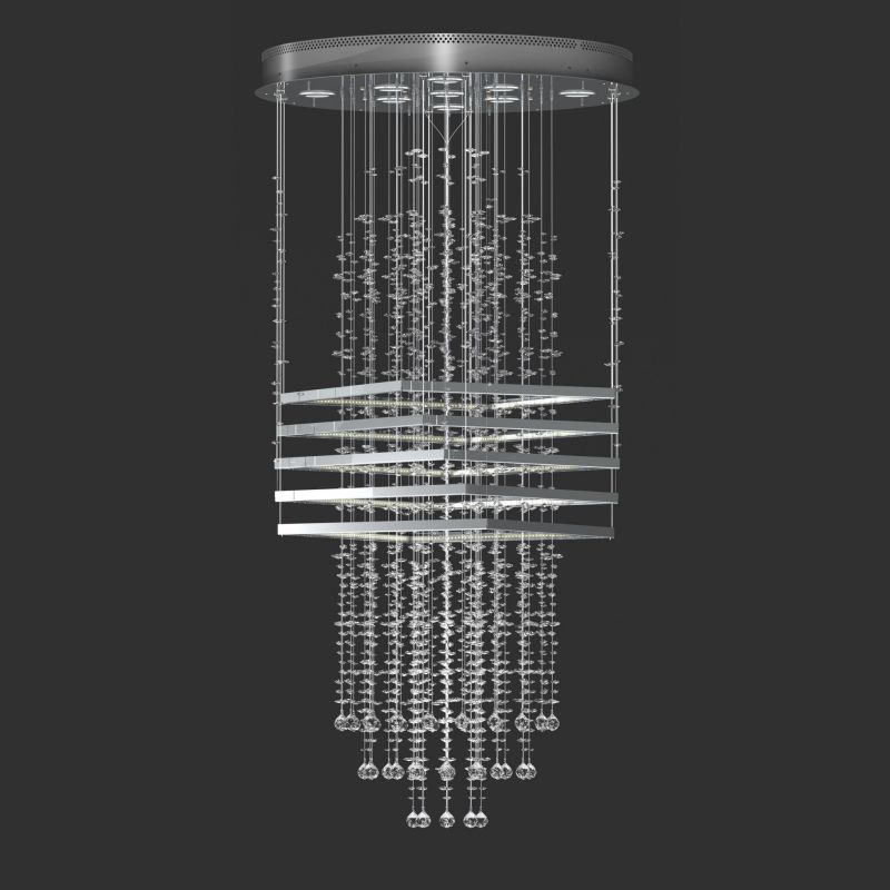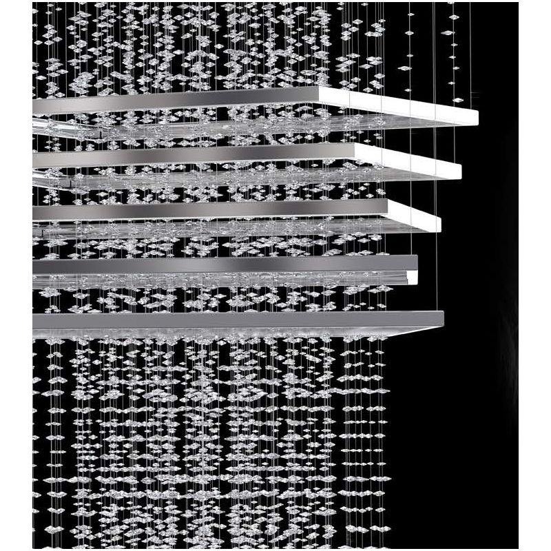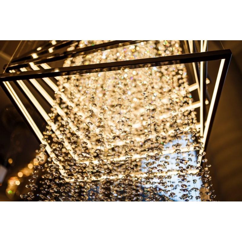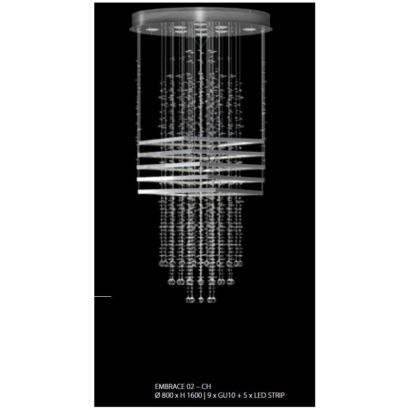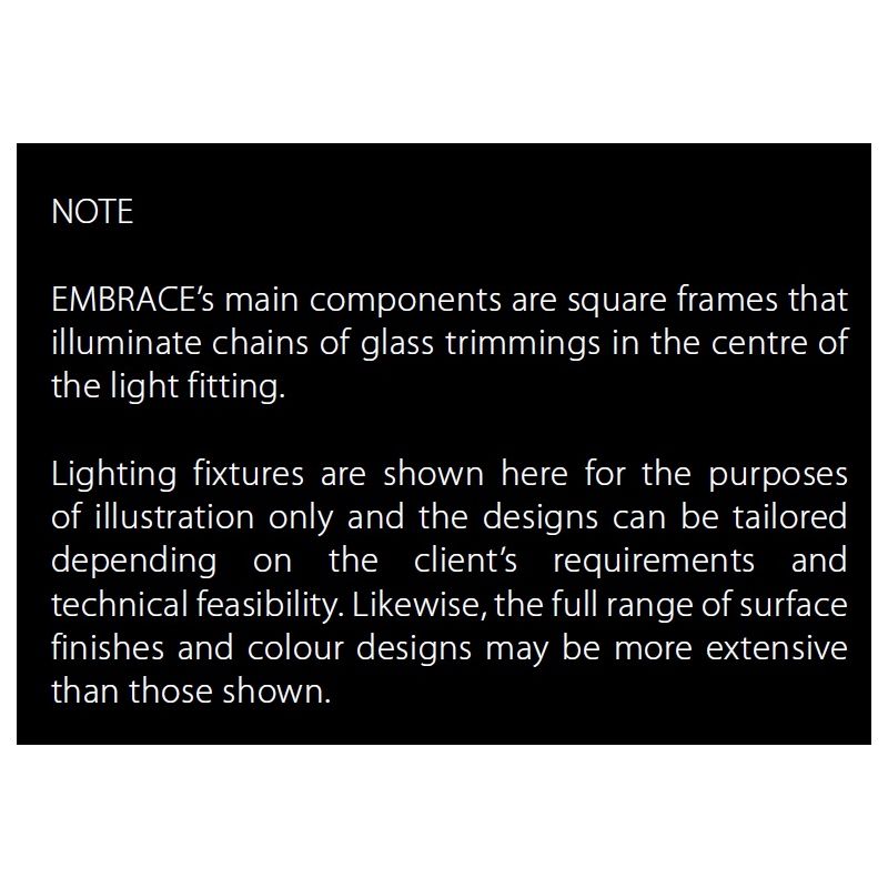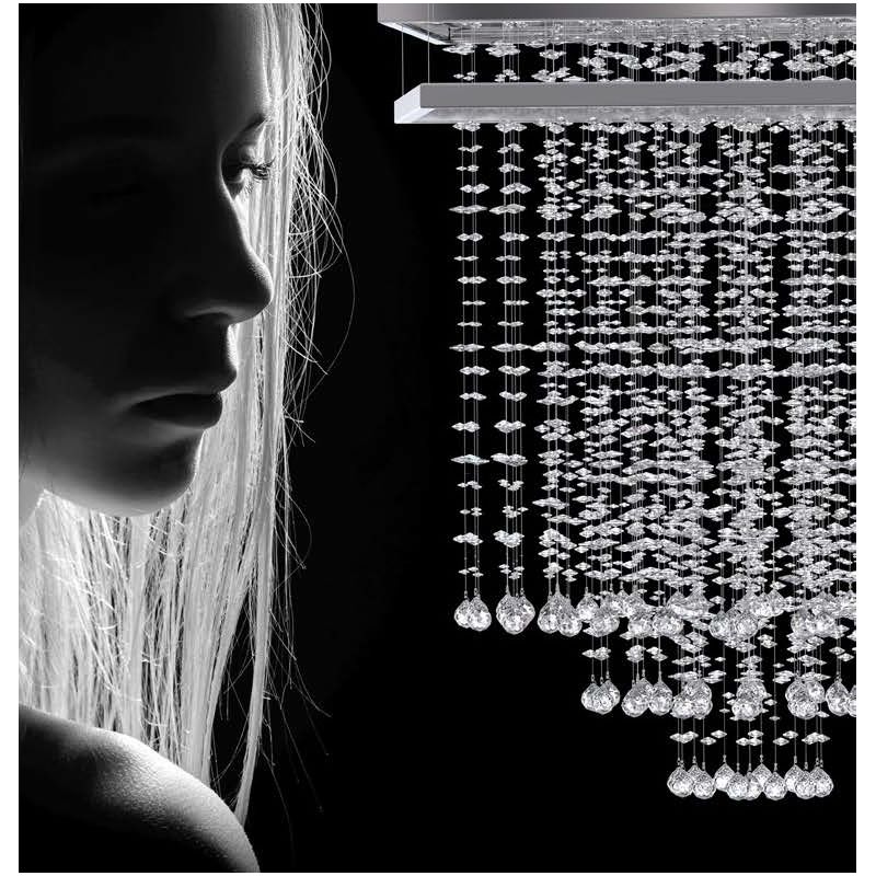 O cascadă de picături fine contrastează inteligent cu liniile puternice ale pătratelor centrale, garantate pentru a fi un plus atrăgător la orice interior. Principalele componente ale gamei EMBRACE sunt cadre pătrate care luminează lanțurile de cristal.