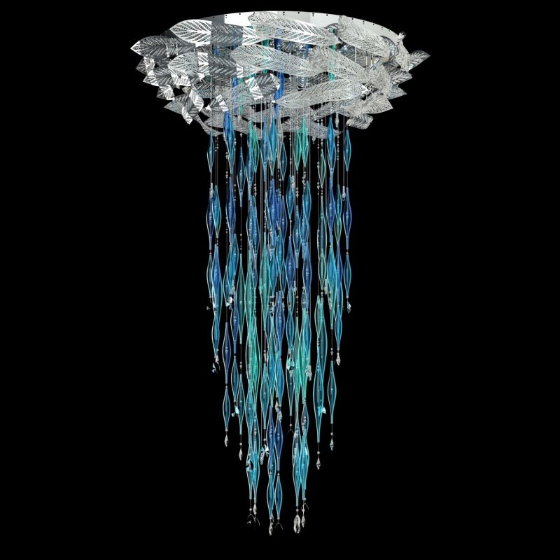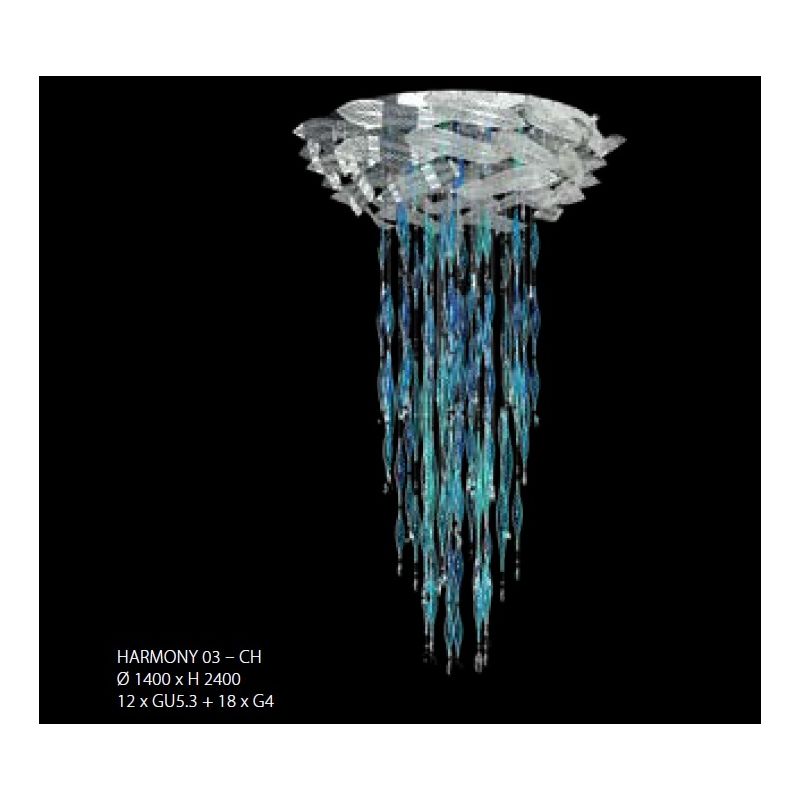 HARMONY, un corp de iluminat care continuă de la un sezon la altul, cu elemente naturale din ambele sezoane. Componente din sticlă formate artistic, modelate cu grijă pentru a crea iluzia unei cascade înghețate în combinație cu frunze metalice pline de garnituri de sticlă sclipitoare.