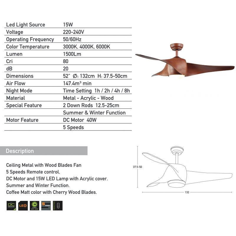 | Informatii produs: | lustra LED cu ventilator cu motor DC 40W, 5 viteze reglabile din telecomanda, miscare reversibila (functie vara/iarna), se poate instala pe un tavan înclinat la -20 grade |