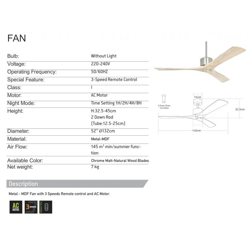 | Informatii produs: | ventilator de tavan cu motor DC 62W, 3 viteze reglabile din telecomanda, miscare cu functie vara |