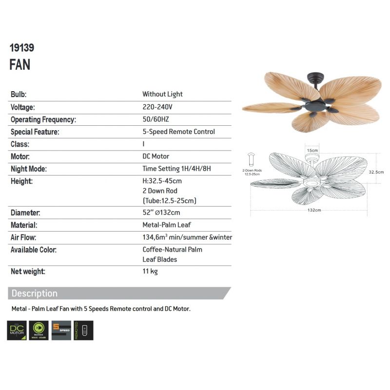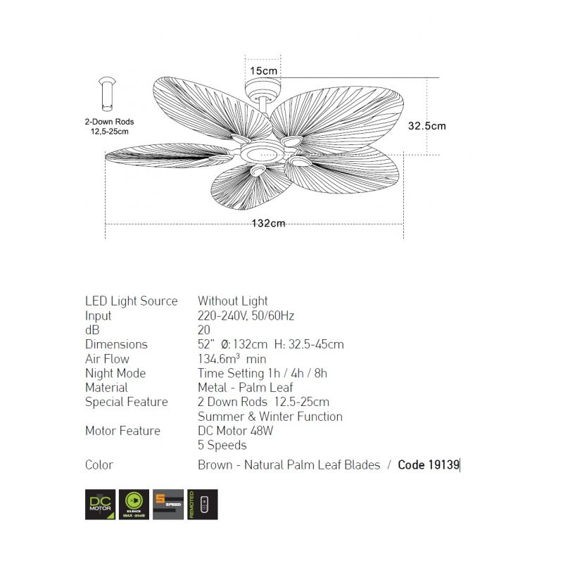 | Informatii produs: | ventilator de tavan cu motor DC 48W, 5 viteze reglabile din telecomanda, miscare reversibila (functie vara/iarna) |
