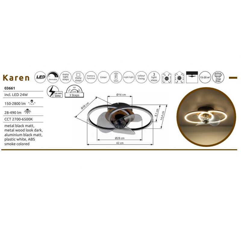 | Informatii produs: | Lustra LED cu ventilator, mai multe niveluri prin comutator de perete, memorie si telecomandă |
