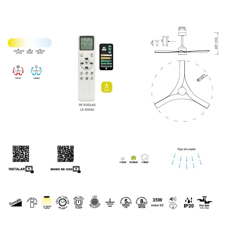 | Putere | 30W, 2400Lm, 2700K-5000K, motor DC 35W, 8 viteze |