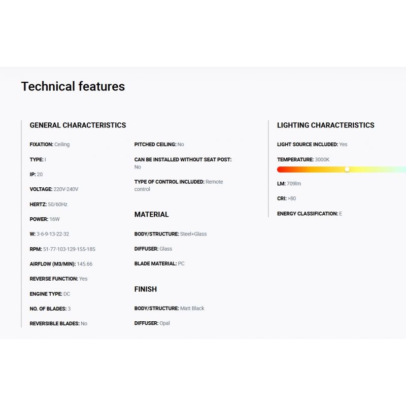 | Materiale | metal, sticla, palate PC negru, difuzor opal |