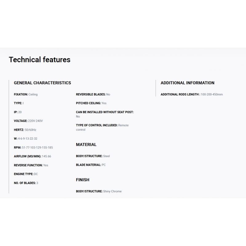 | Informatii produs: | ventilator cu telecomanda, cu functie reversibila iarna-vara, 6 trepte de viteza reglabile 4-6-9-13-22-32Watt si 51-77-103-129-155-185rpm. |