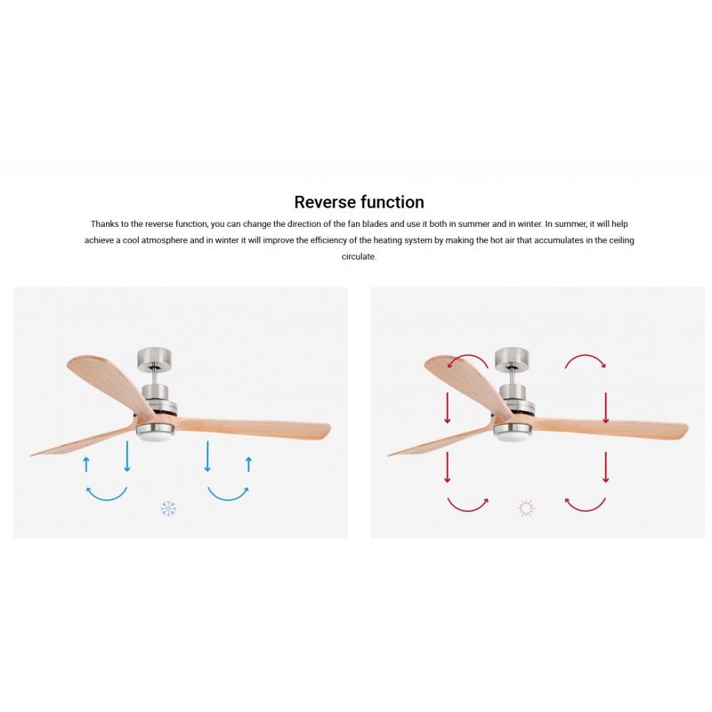 | Informatii produs: | lustra cu ventilator si telecomanda, cu functie reversibila iarna-vara, 3 trepte de viteza reglabile 24-39-82Watt si 70-95-135rpm |