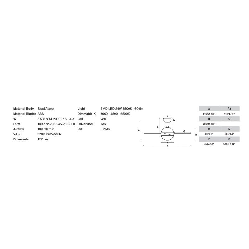 | Informatii produs: | Ventilator cu telecomanda, cu functie reversibila iarna-vara, 6 trepte de viteza reglabile 5,5-8,8-14-20,6-27,5-34,8Watt si 139-172-206-245-268-300rpm, activat prin telecomandă inclusă |
