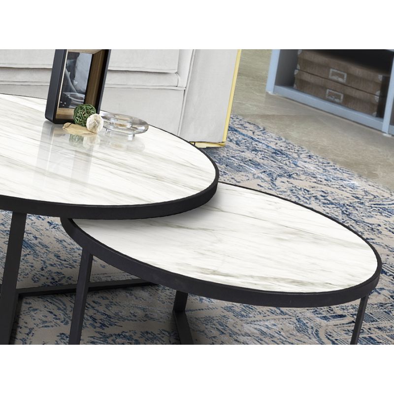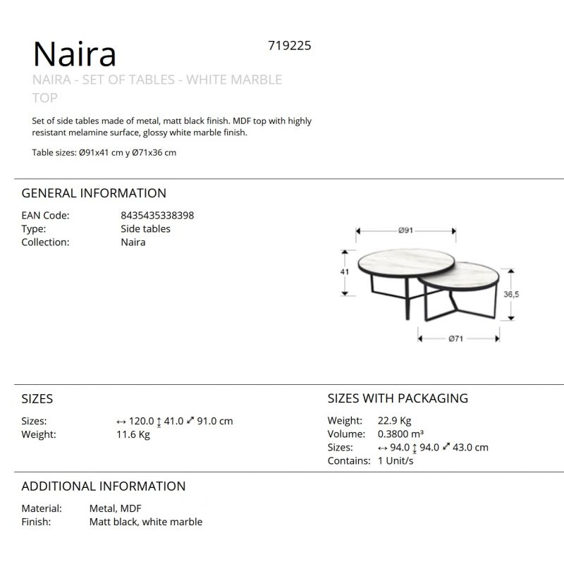 | Materiale | set mese laterale din metal, finisaj negru mat, blat din MDF cu suprafata melaminata foarte rezistenta, finisaj marmura alba lucioasa |