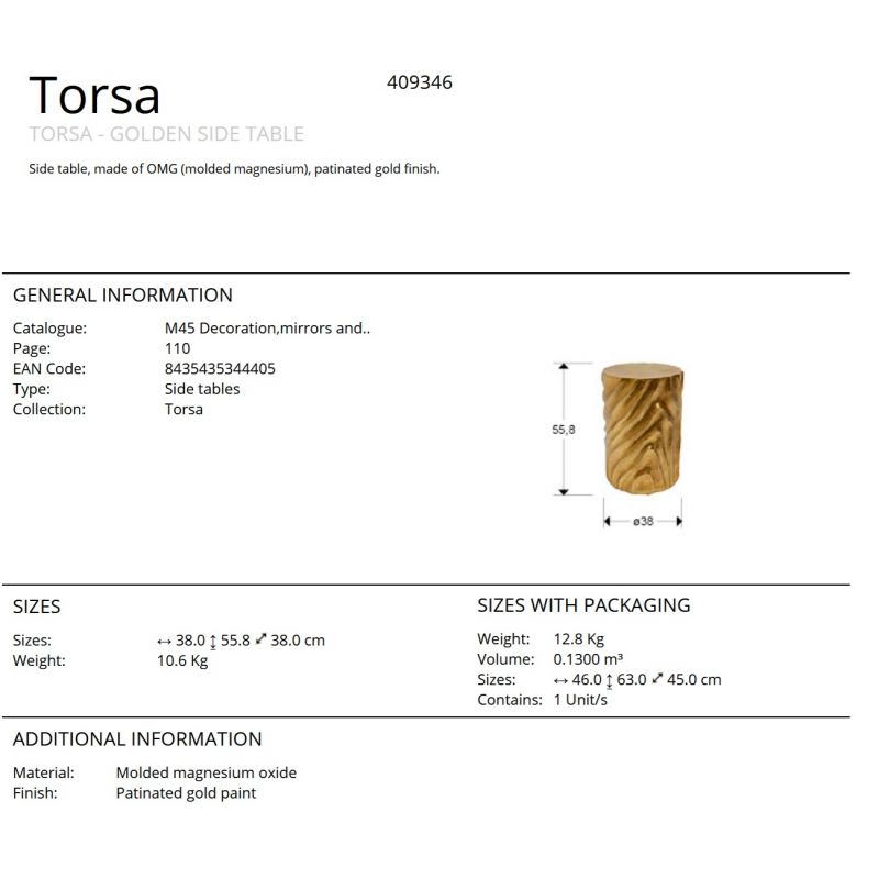 | Materiale | măsuță laterală realizată din OMG (magneziu turnat), textură de ciment, finisaj auriu patinat |