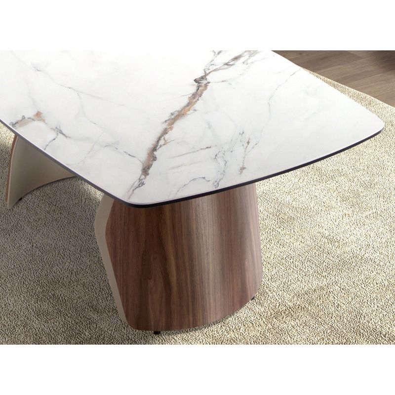 | Materiale | blat din marmura portelanata alba cu nervuri gri si maro, finisaj mat, furnir lemn de nuc, otel inoxidabil cu efect metalic de culoare nisip |