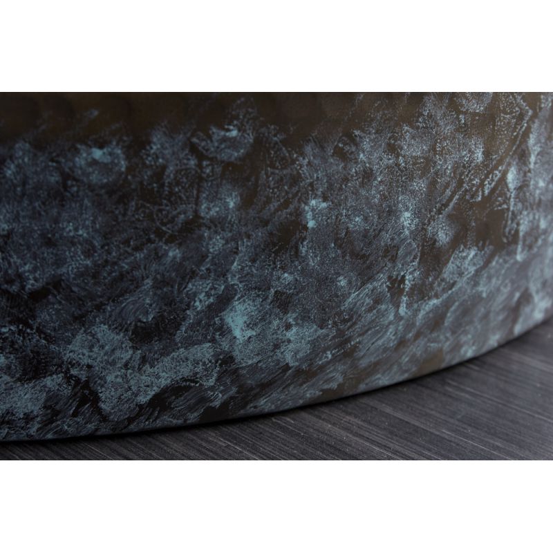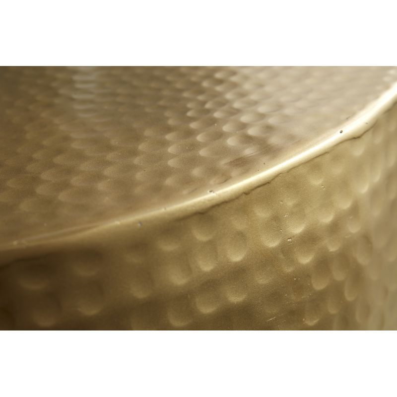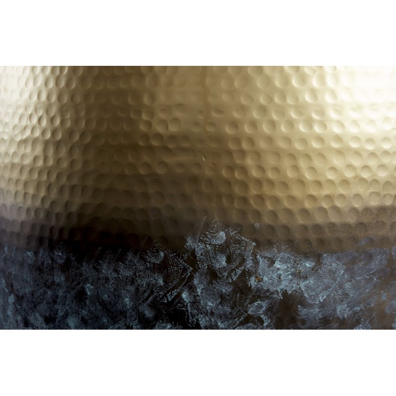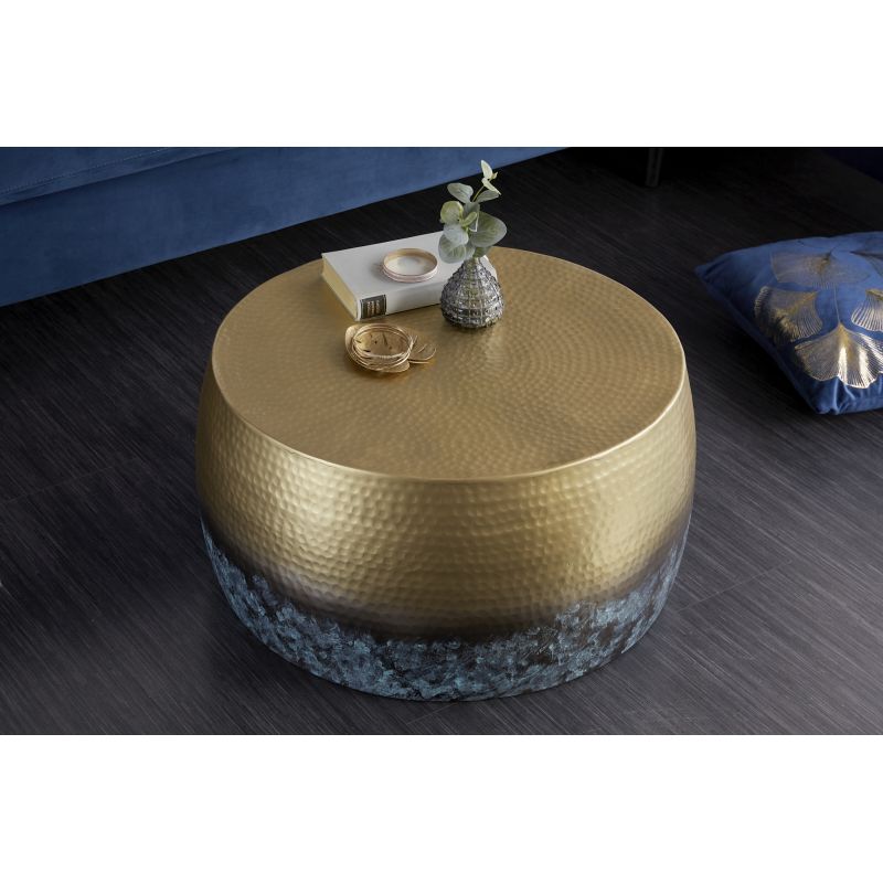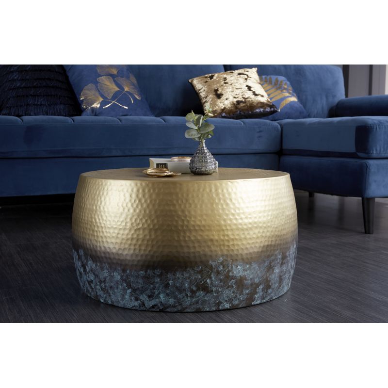 Aspectul elegant auriu formează un contrast frumos cu baza întunecată a mesei - ambele suprafețe au fost create manual. Micile umflături fac ca fiecare copie să fie unică și să depună mărturie despre lucrarea manuală complicată care a fost investită în fiecare dintre mese. Datorită designului său atrăgător, puteți combina fără efort masa de cafea cu o varietate de mobilier, culori și materiale textile.