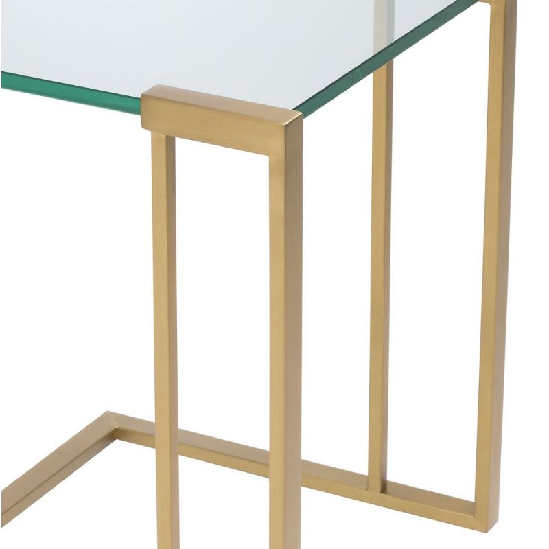 Masuta laterala design LUX Perry, realizata din otel finisaj alama periata cu blat din sticla transparenta este o piesa ideala pentru un interior cu design modern.