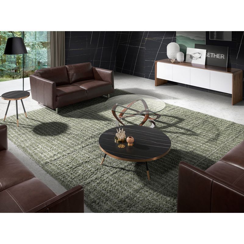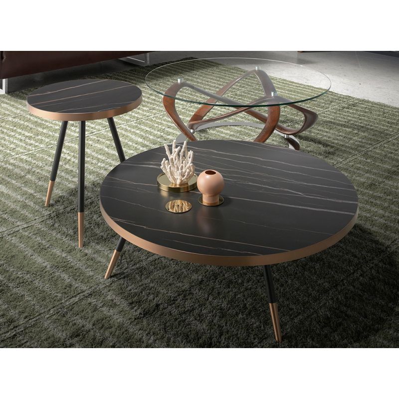 Masuță de cafea rotundă din marmură neagră portelanată și picioare din metal. Această masă laterală originală, cu un stil elegant și sofisticat, este ideală pentru a aduce atingerea căldurii și stilului pe care îl căutați în camera dvs. de zi, precum și pentru a oferi o notă diferită și unică datorită finisajului marginii sale circulare și a finisajului picioarelor din oțel cu baie cromată în ton bronz.