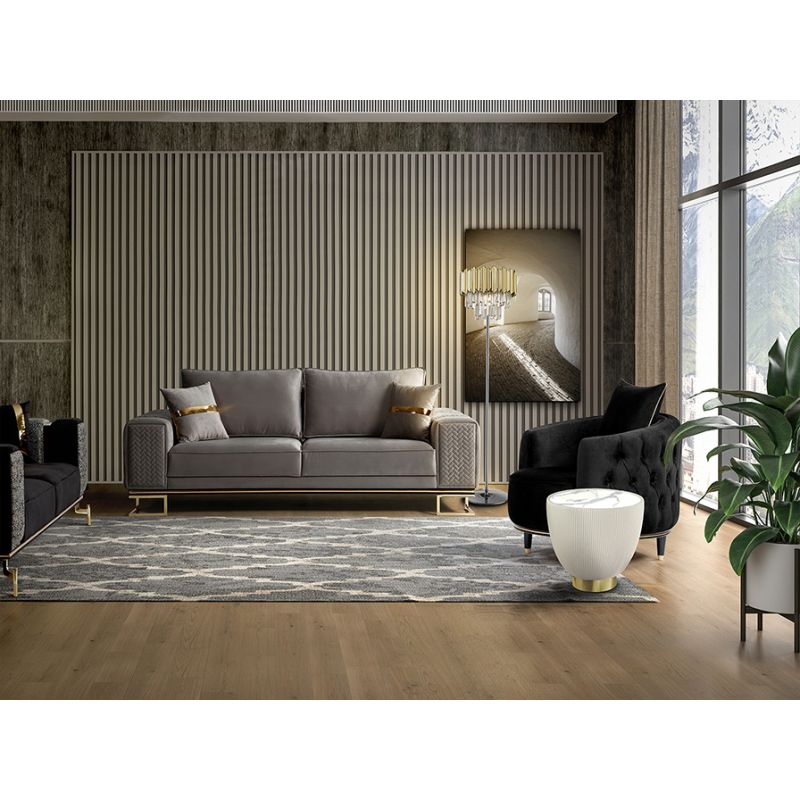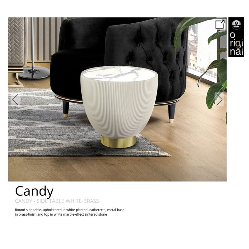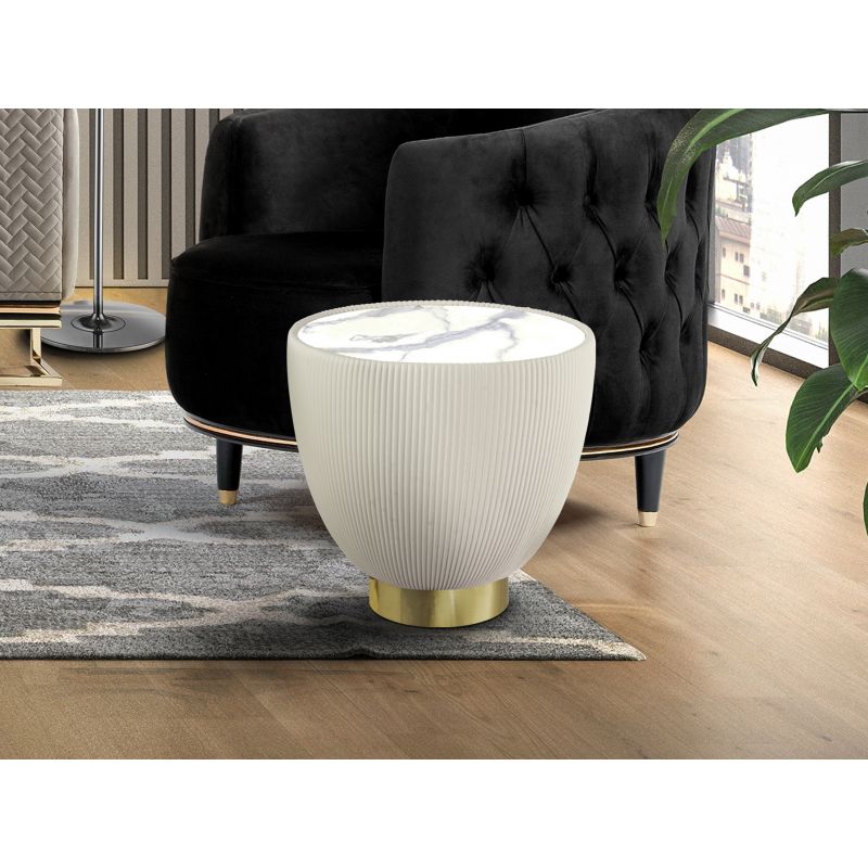 | Descriere | masuta laterala rotunda, tapitata cu piele alba plisata, baza metalica cu finisaj alama si blat din piatra sinterizata cu efect de marmura alba |