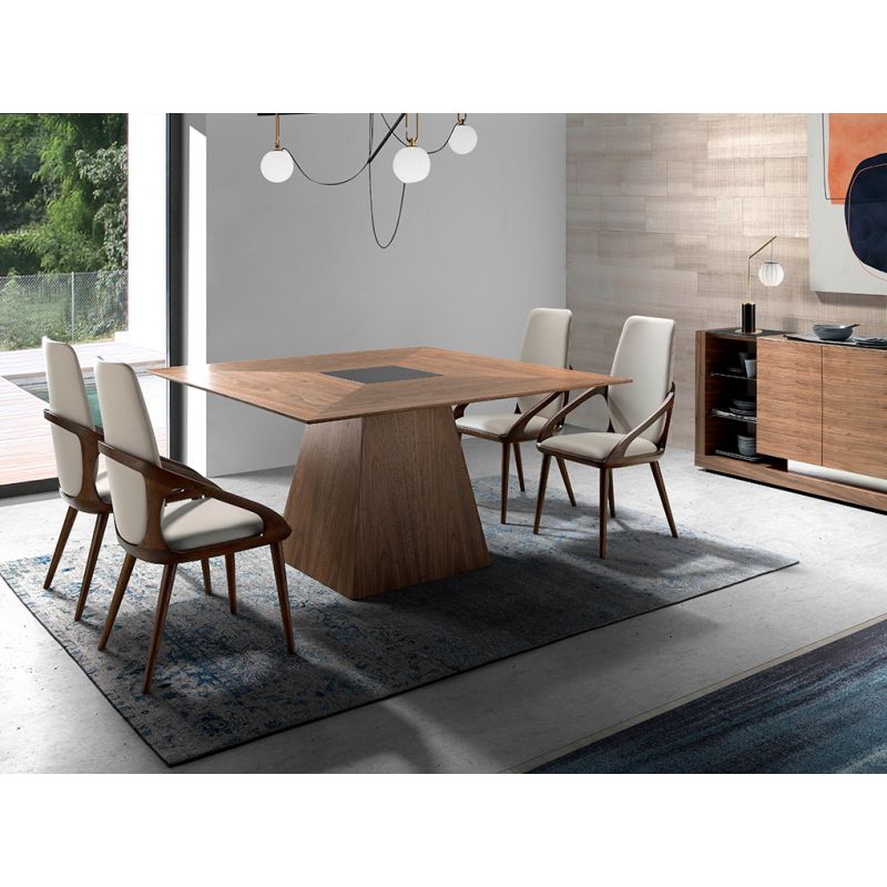 Masă elegantă design LUX Tokyo, masă de luat masa pătrată cu blat fix și structură din furnir natural de nuc de 0,5 mm grosime. Detaliul central original din sticlă neagră adaugă acel stil elegant și sobru pe care îl căutați în sala de mese. Datorită dimensiunilor și formei sale, este ideala pentru a vă găzdui oaspeții într-un mod practic și cu confort maxim.