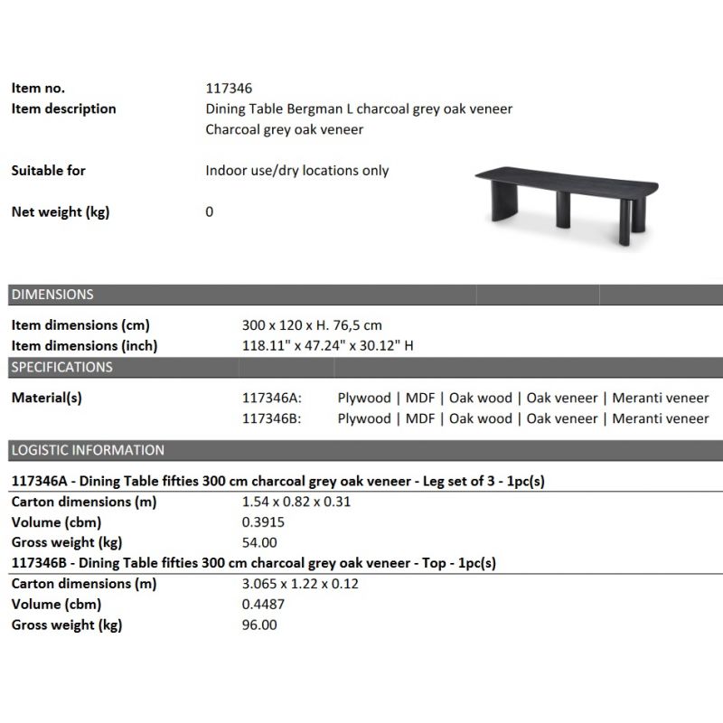 Masa design LUX Bergman L Charcoal grey, 300x120cm