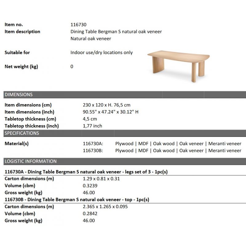 Masa design LUX Bergman S furnir stejar, 230x120cm