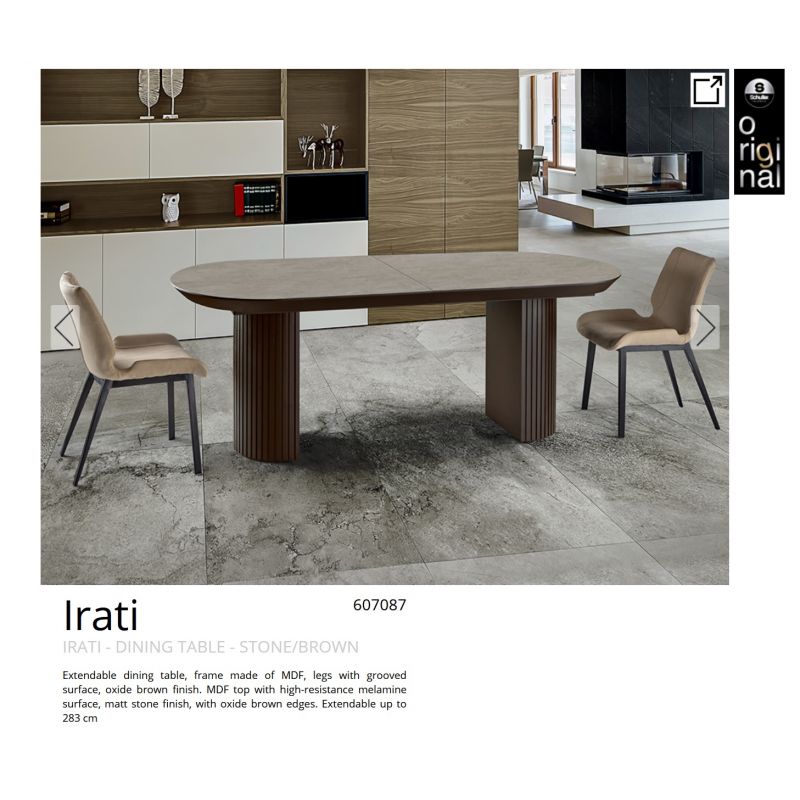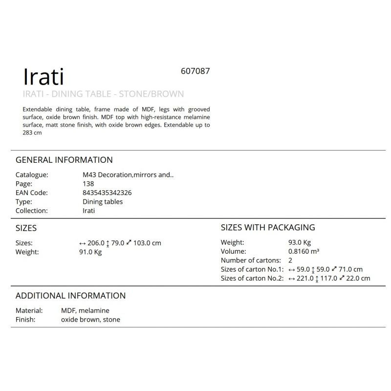 | Materiale | masa de sufragerie extensibila pana la 283cm, cadru din MDF, picioare cu suprafata canelata, finisaj maro oxid, blat din MDF cu suprafata melaminata de inalta rezistenta, finisaj piatra mat, cu margini maro oxid |