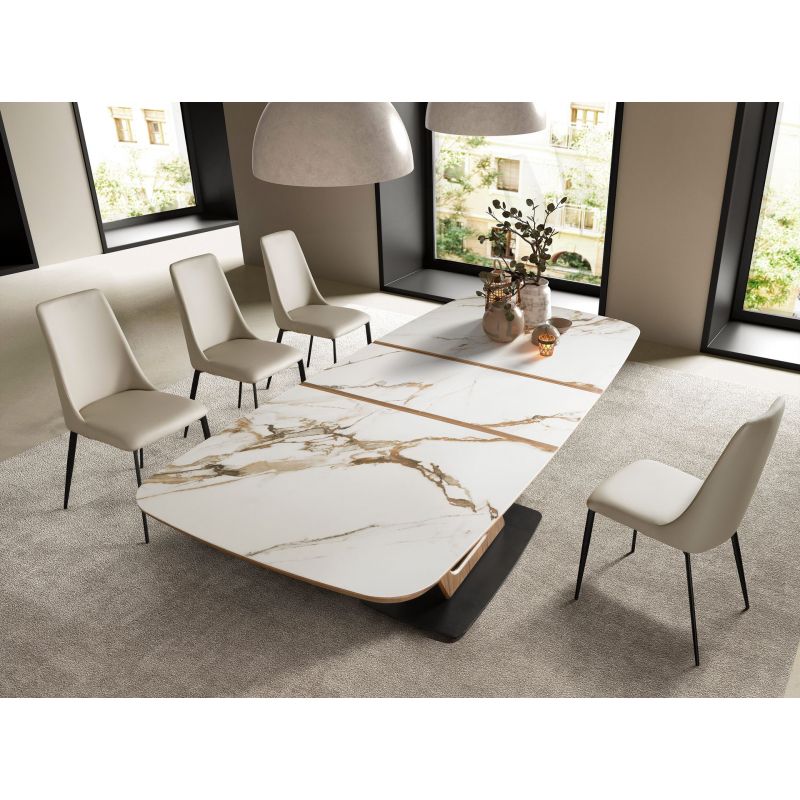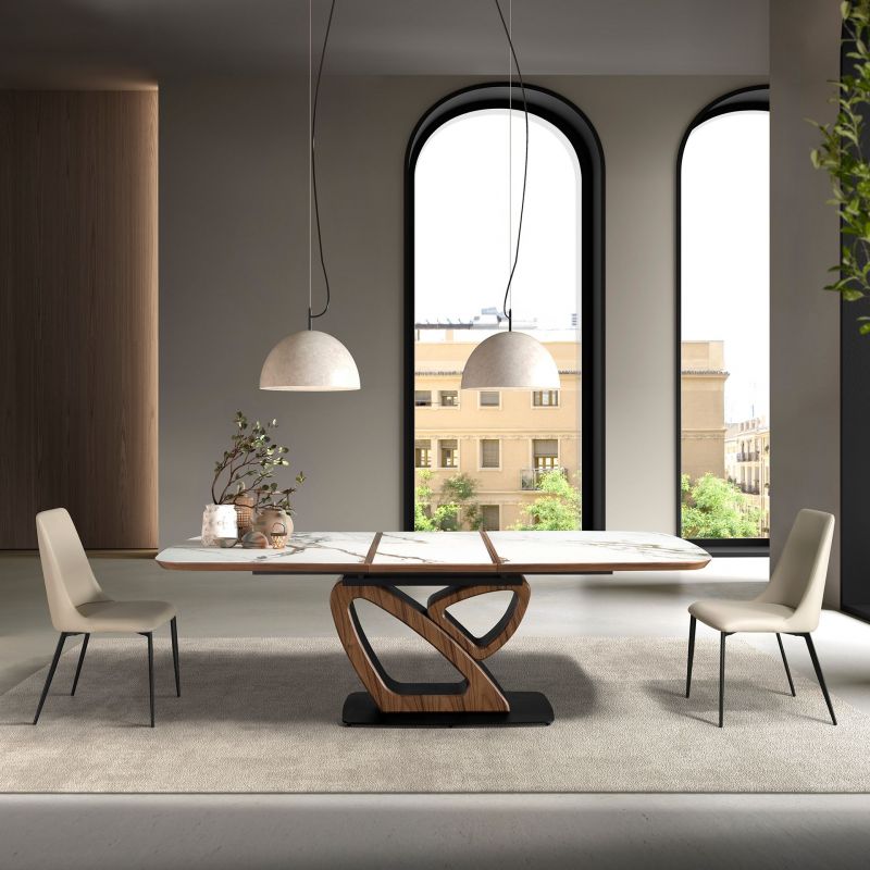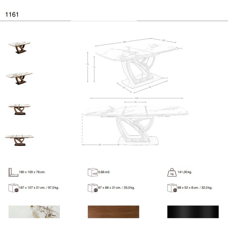 | Materiale | blat din marmura alba din porțelan, cu nervuri gri și maro, finisaj mat, picioare lemn furniruit cu nuc natural, baza din otel negru |