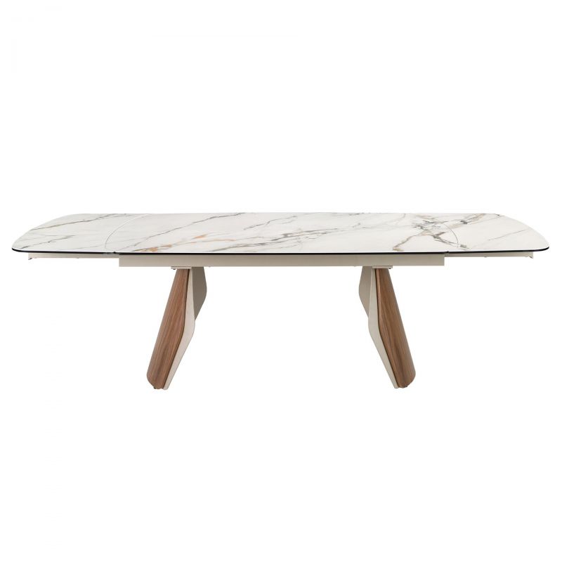 | Materiale | blat din marmura portelanata alba cu nervuri gri si maro, finisaj mat, furnir lemn de nuc, otel inoxidabil cu efect metalic de culoare nisip |